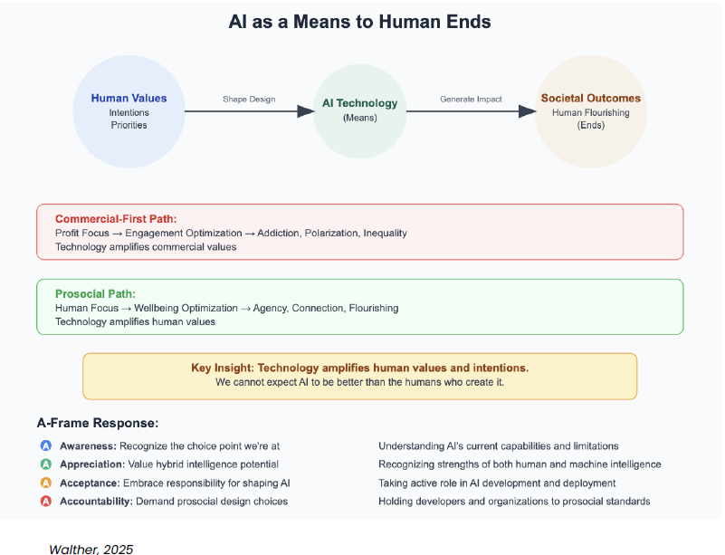 The transition to prosocial AI won’t happen automatically. It requires deliberate action from individuals, organizations, and society as a whole. The path forward requires a mindset that has four characteristics: Awareness of our current choice point, Appreciation for the complementary strengths of human and machine intelligence, Acceptance of our responsibility to shape AI development, and Accountability for ensuring prosocial outcomes. Referred to as the A-Frame mindset it provides a practical framework for the required transformation: